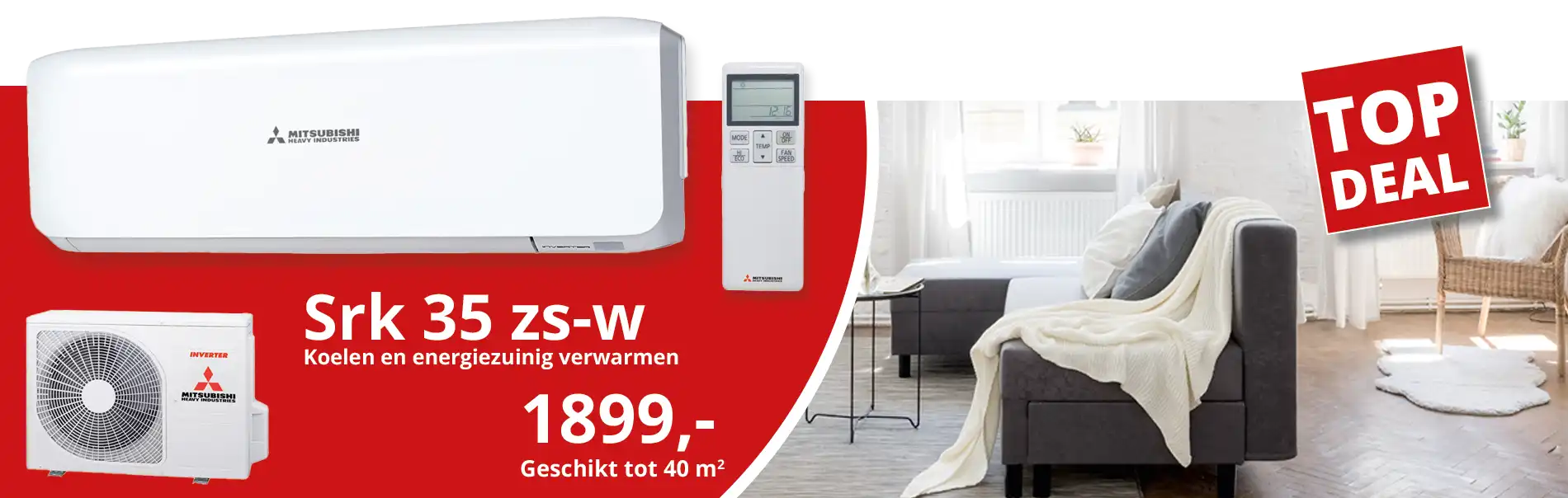 Mitsubishi Heavy Industries SRK 35. Het wandmodel is de meest populaire airconditioner. Dit type is het stilste, meest energie-efficiënte en tevens het voordeligste. Het wordt hoog aan de muur gemonteerd en is ideaal voor zowel het koelen als het energiezuinig verwarmen van woningen en kleine bedrijfsruimtes. De bediening gaat  via een infrarood afstandsbediening.